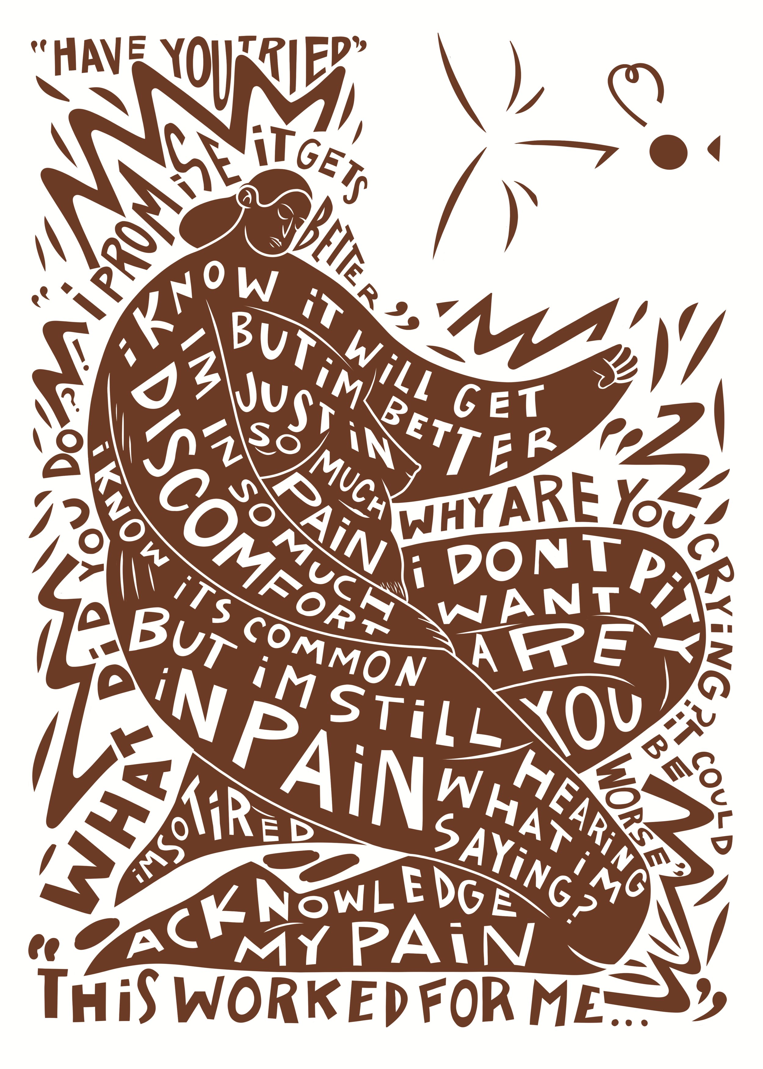 This was a small fold out zine design that had been picked up, scribbled on and put down for many years. Originally the focus was on the paper layout as an extra flourish for extending the narrative. However, the story changed to allow for me to put down on paper recent run ins I’d had with injury and poor health and feeling the pressure to show up or express my pain only in certain ways.