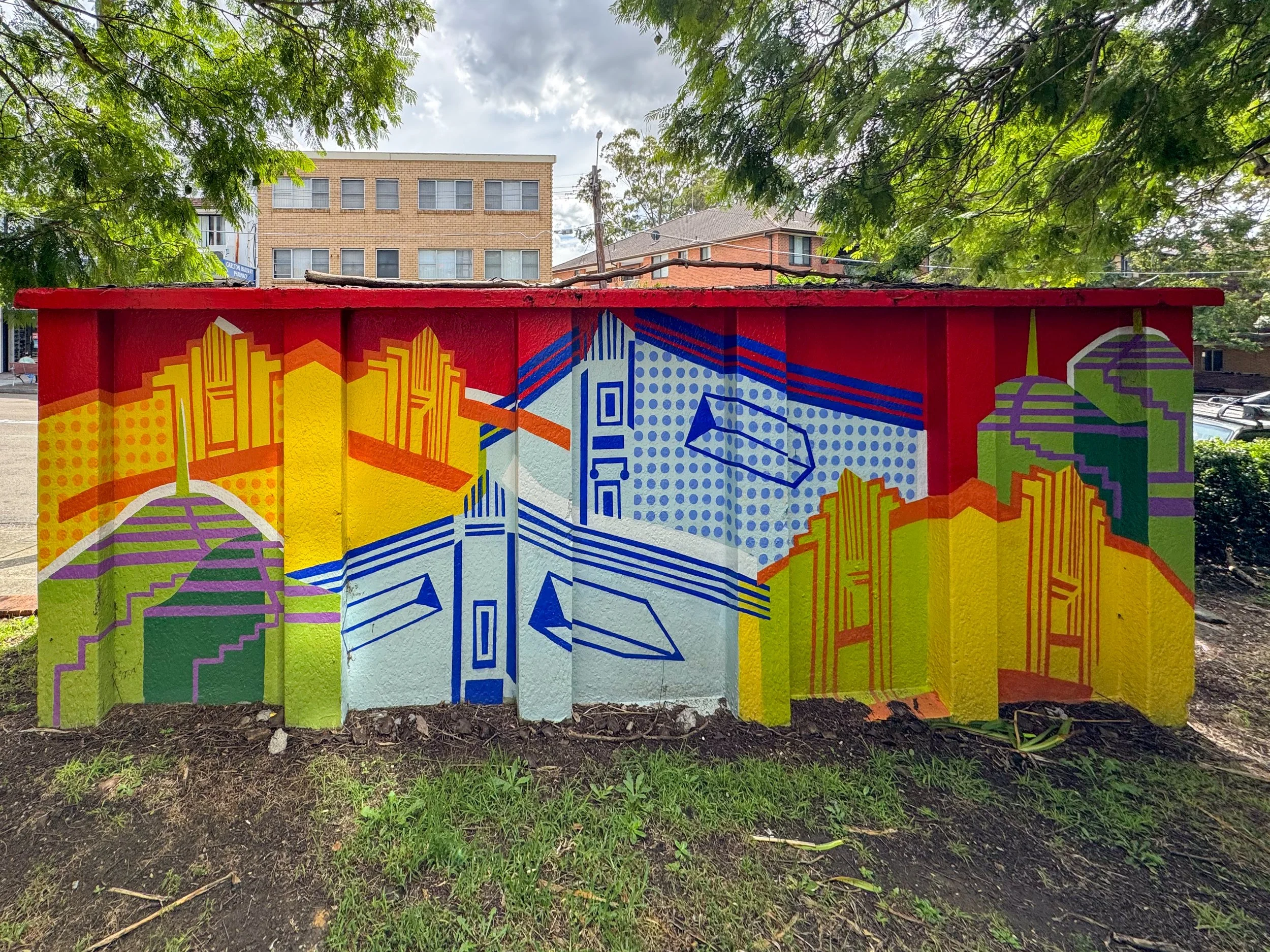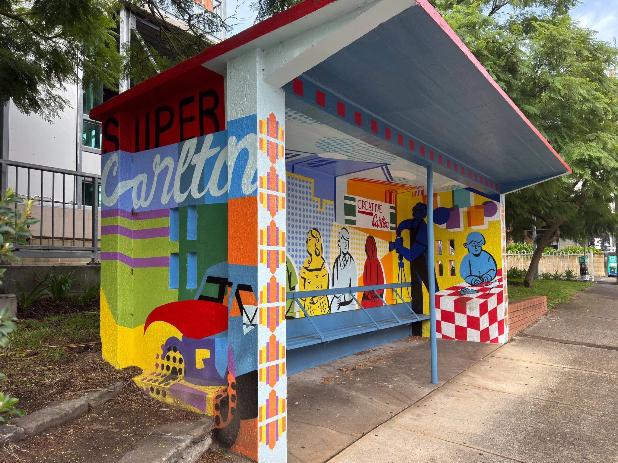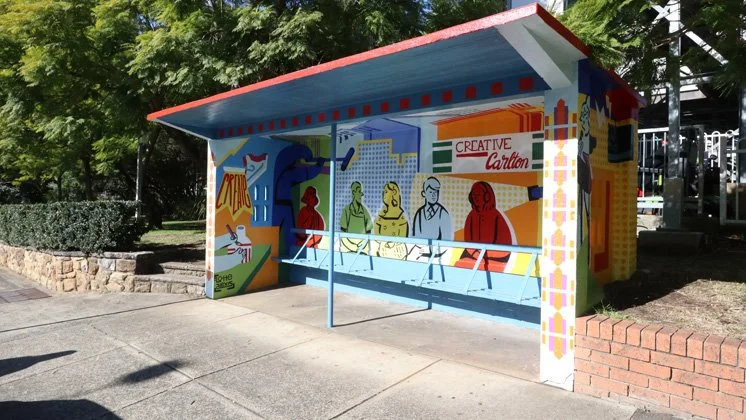The goal of this project was to set out to capture the creative hub that is Carlton, and reinvigorate the old bus stop and give it new life and meaning. The mural references the art deco architecture of local buildings, and arts organisations such as Bus Stop Films, Shopfront Theatre and Carlton School of Arts.