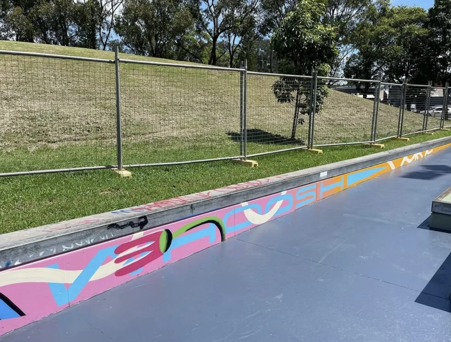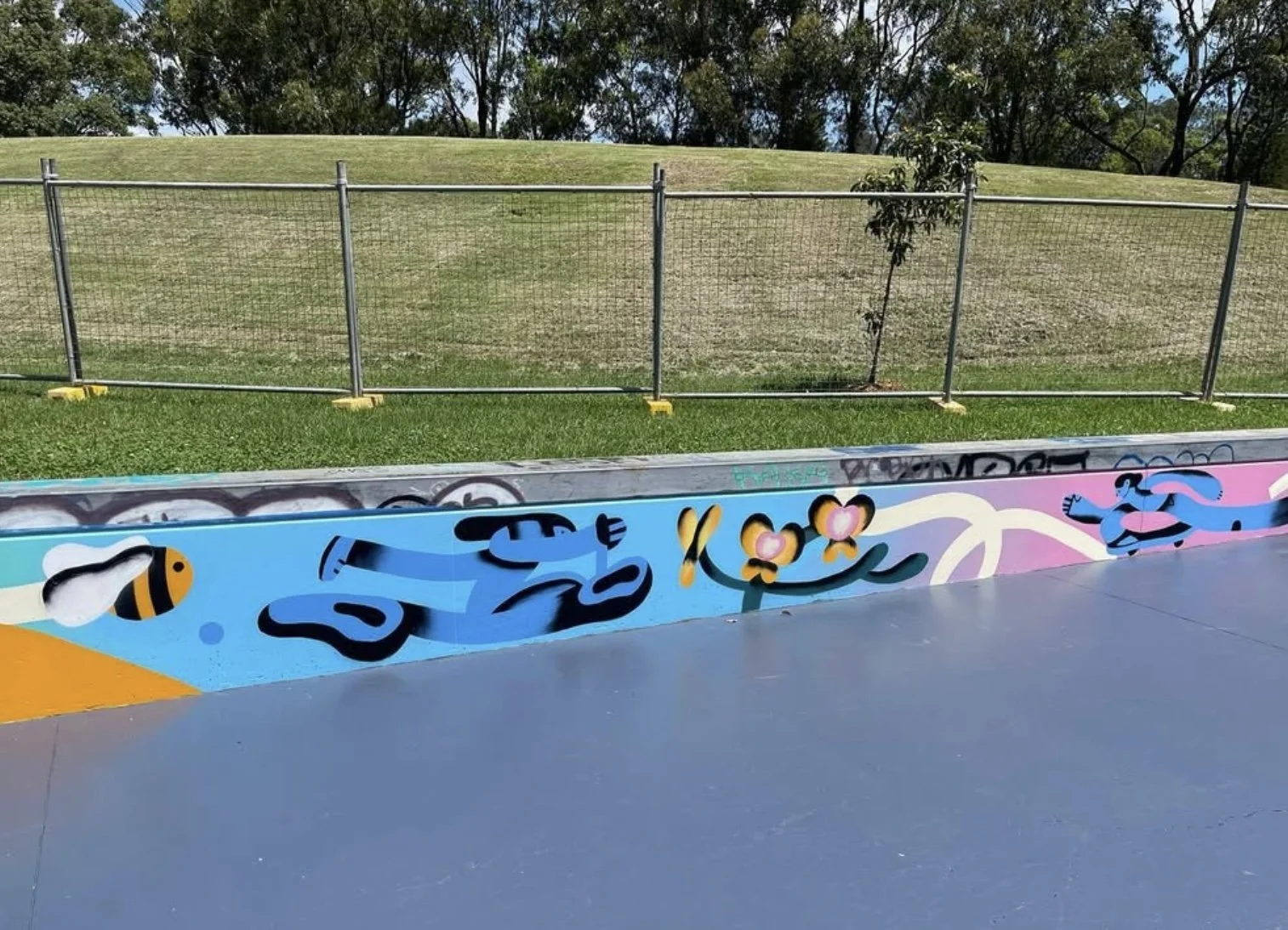 In this mural I wanted to reference the amazing sunsets you can see from Mutch Skatepark, local native plants such as lilli pillis and the flight path, woven in around people skating, skooting and roller skating.